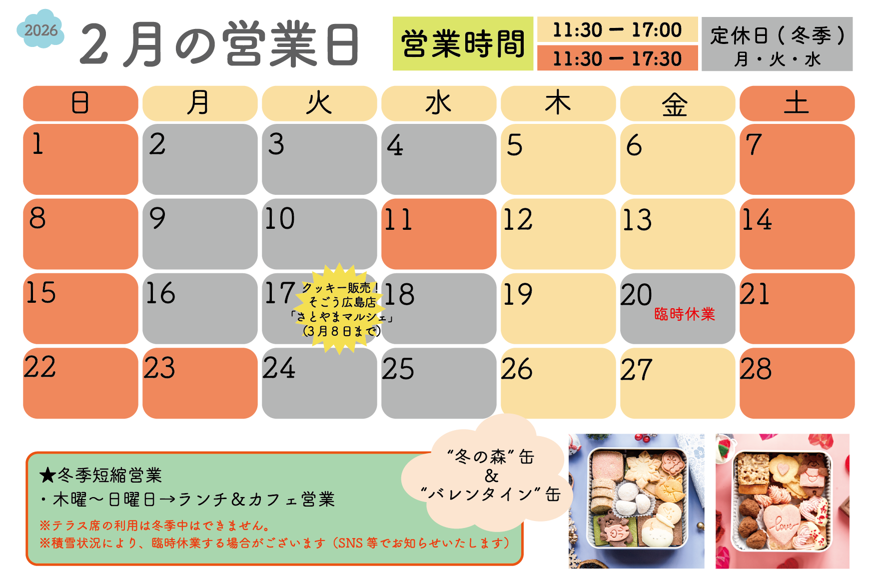 ● 積雪状況により、臨時休業する場合がございます(SNS等でお知らせいたします)