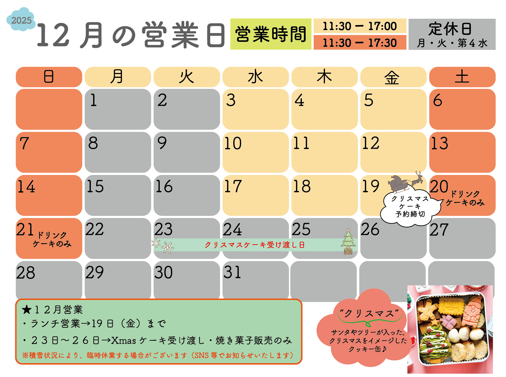 (水曜日:ドリンク&ケーキのみ、木〜日曜日:ランチ営業)とします