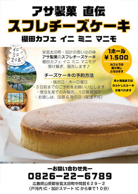 加計商店街にあるアサ製菓さんから、直伝でスフレーチーズケーキを受け継ぎ、販売することとなりました。