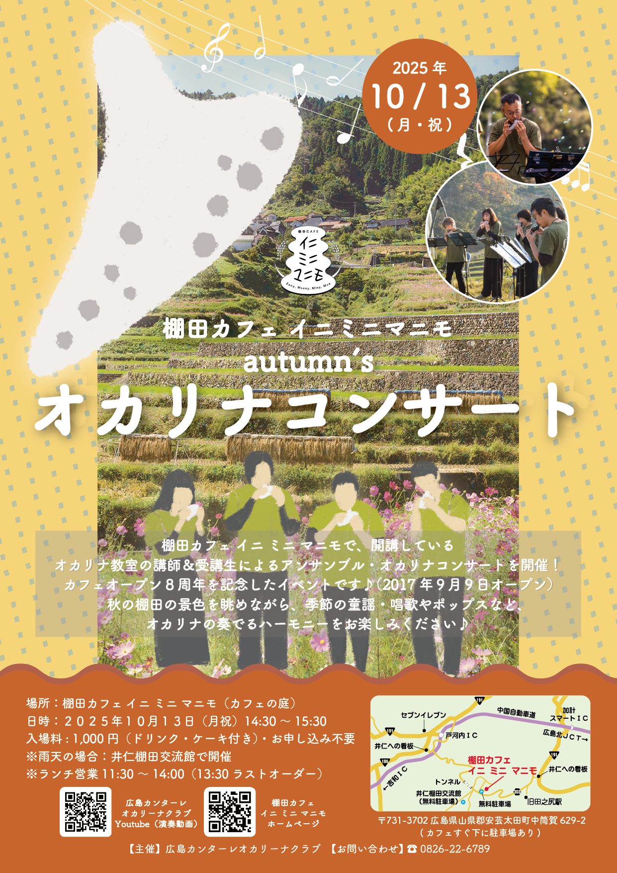 2023/09/21(木) イベント autumn's オカリナコンサート2023開催!棚田カフェ イニ ミニ マニモで、開講している オカリナ教室の講師&生徒による アンサンブル・オカリナコンサートを開催! (カフェオープン6周年記念)  秋の棚田の景色を眺めながら、季節の童謡・唱歌やポップスなど、オカリナの奏でるハーモニーを お楽しみください♪ 日 時: 10月9日(月祝)14:30~15:30 入場料: 800円(ドリンク・ケーキ付き)※開演中は、通常のオーダーはできません 場 所: 棚田カフェ イニミニマニモ(テラス庭) 〒731-3702 広島県山県郡安芸太田町大字中筒賀629-2     ※雨天時は、井仁棚田交流館で開催 お願い: ご来店時の消毒・マスク着用にご協力ください。発熱や咳等の症状がある方はご遠慮ください。 ※ランチ営業11:30~14:00(13:30ラストオーダー)