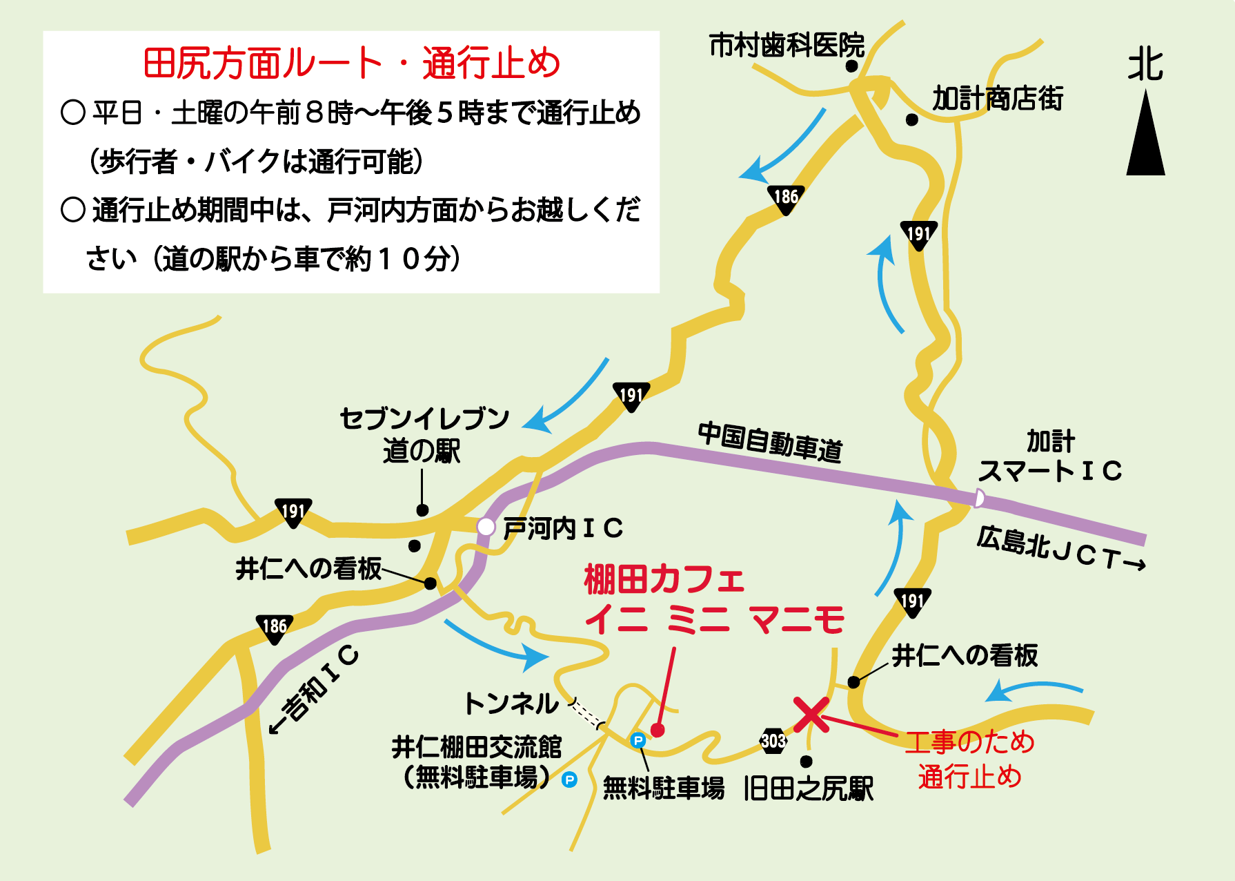 *通行止め期間中は、戸河内方面からお越しください(戸河内の道の駅から車で約10分)