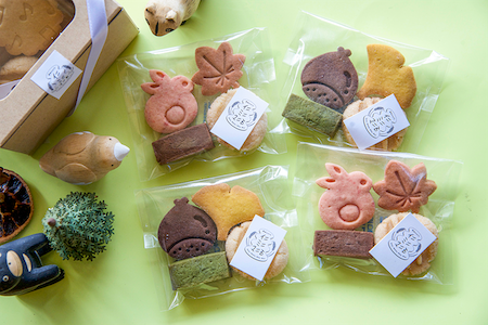 季節のモチーフクッキー(苺、ココア、小松菜、かぼちゃ味など)と、 サブレ(プレーン)、しかくクッキー(ココア、抹茶、きな粉味など)、を包装したものを4袋セットで箱に詰めています。