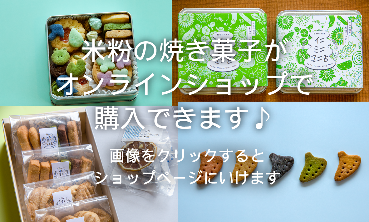 棚田カフェイニミニマニモでは、棚田の米粉を使ったクッキーなどの焼き菓子を製造・販売しております。地域の食材を使って、季節ごとに変わる可愛いクッキーを詰めたクッキー缶やボックスなど、当店&道の駅「来夢とごうち」で販売中!また、オンラインショップ「BASE」にて、焼き菓子&グッズの通販をしております。ぜひお店に来れない方もお楽しみいただけたらと思います♪